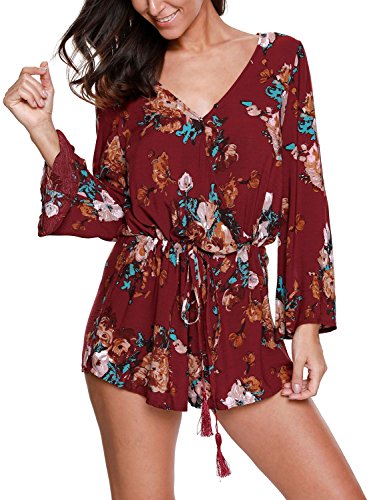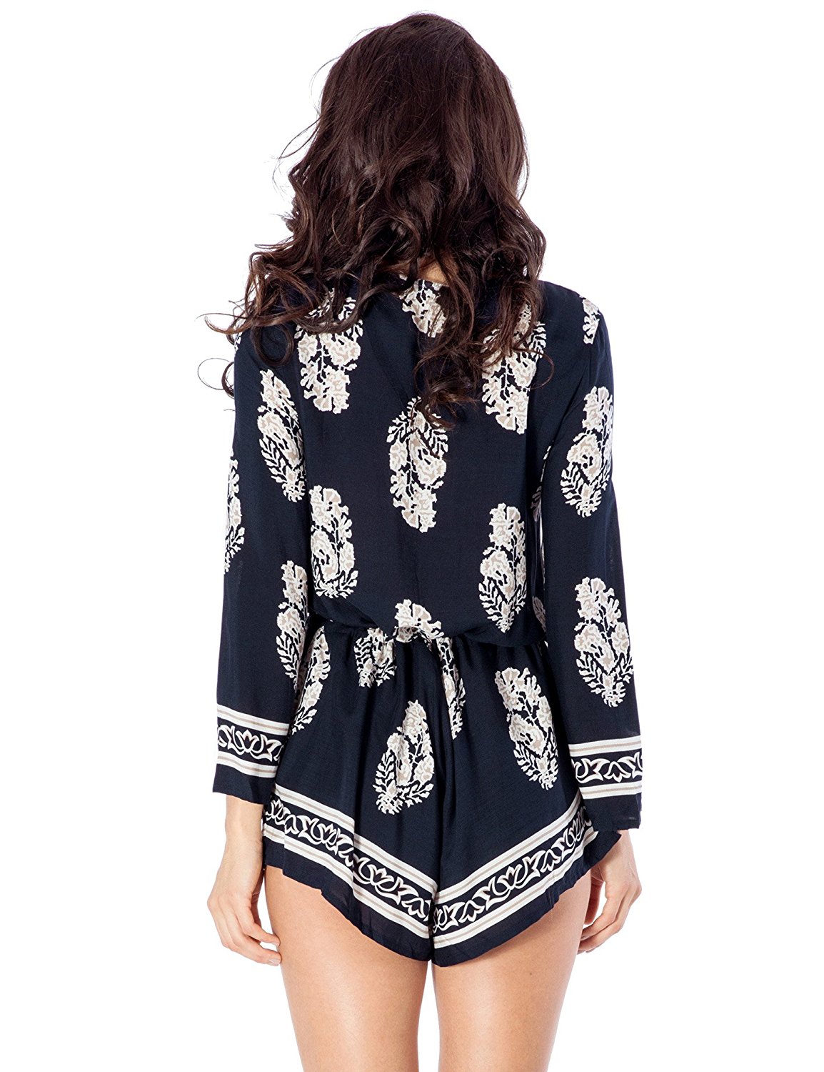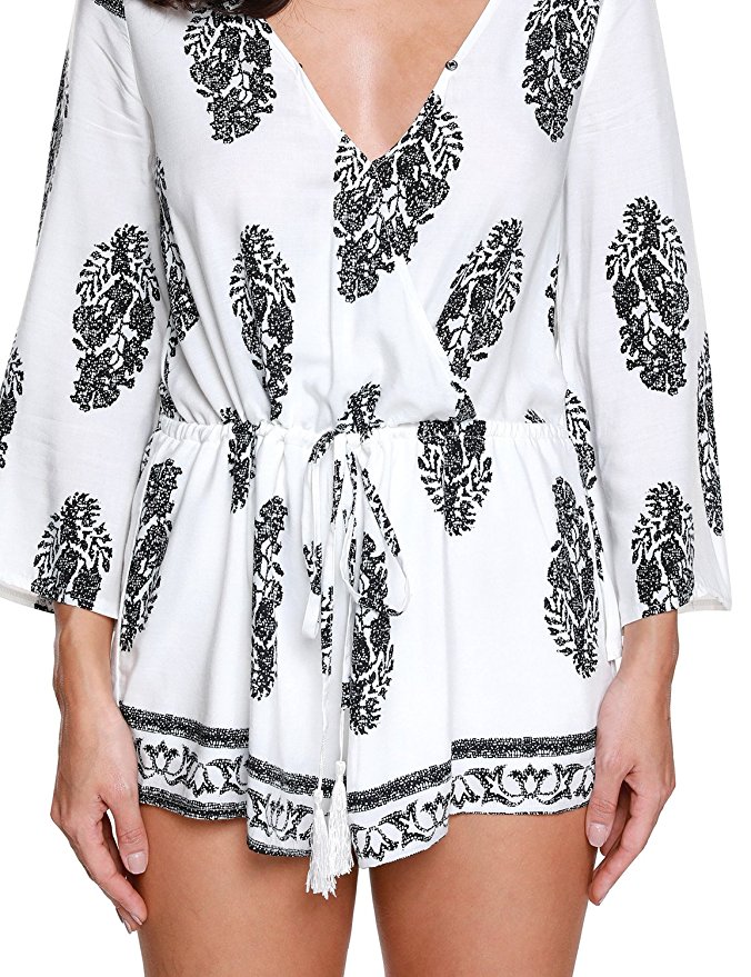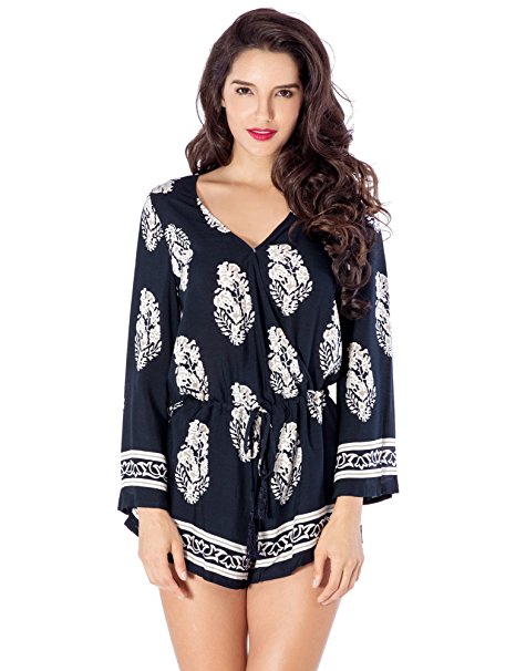 This romper features a surplice V neckline and the trumpet sleeves, an adjustable tie and elastic waist, foliage print all around. Lined at bottom, no stretch.